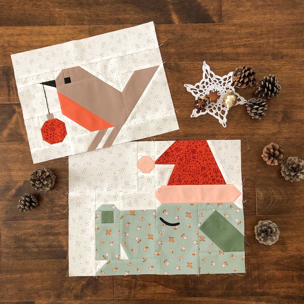 The fabrics in this bundle are a mix of Riley Blake prints and Confetti Cottons, and Kona Cotton Solids. The dragon’s body is “Forgotten Memories, Blossom in Sea Glass” and the background is “Hush Hush, Criss Cross”, both by Riley Blake. “Hush Hush, Criss Cross” is an off-white featuring a small black “x” print. The fabric for the dragon’s hat and the ornament is “Spark in Cayenne Metallic” by Ruby Star Society (not the floral print shown in the last two photos!). Each fabric is labeled and a tutorial for how to combine the dragon and robin elements can be found here.
