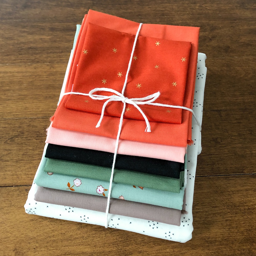 This bundle includes all the fabrics needed to make the quilt shown in the mock-up and photos (finishing at about 42″ x 55″). It is a mash-up of several different quilt patterns, please see details below.